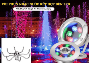 Khám phá vòi phun nhạc nước kết hợp đèn LED hiện đại. Hiệu ứng ánh sáng – âm thanh sống động, phù hợp thi công đài phun nghệ thuật, sân vườn, resort, sự kiện ngoài trời.